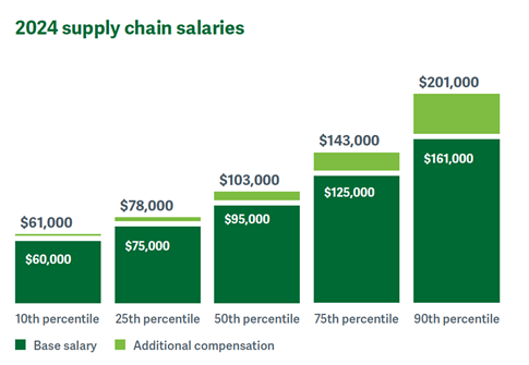 According to the ASCM 2024 Supply Chain Salary and Career Report, general salaries in the United States continued their upward trajectory, with a 4% increase year-over-year. This impressive growth pushed the median compensation for supply chain professionals past a major milestone, reaching a record-breaking $103,000.